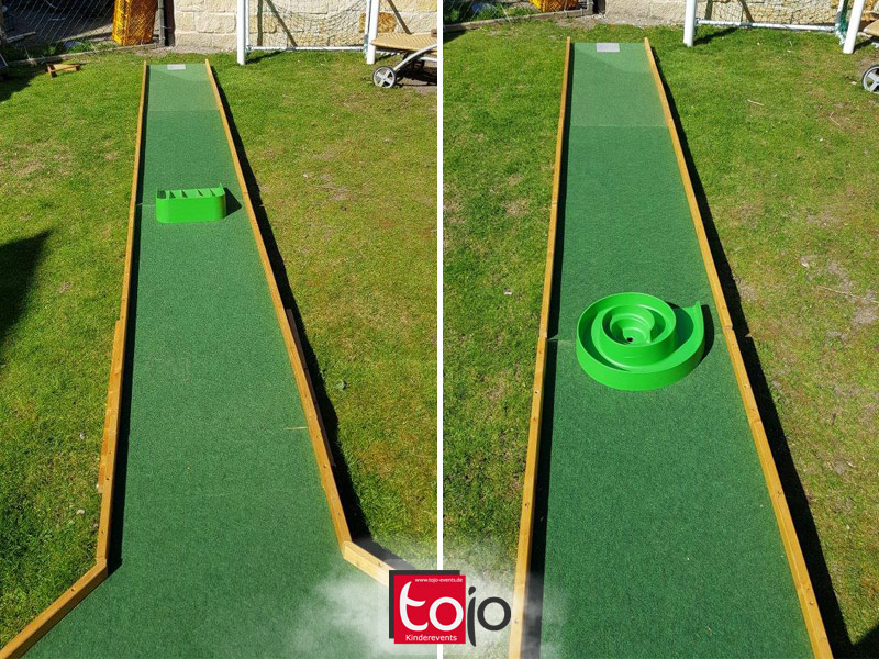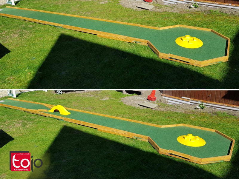 Mieten Sie unsere mobile Minigolfbahn, sie ist innerhalb ganz weniger Sekunden mit einem neuen Hindernis versehen und damit in die nächste verwandelt.
