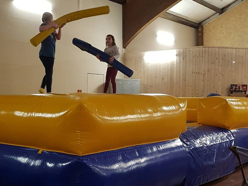 2 Spieler versuchen, sich gegenseitig mit den gepolsterten Kampfstangen vom Podest herunterzuschubsen.