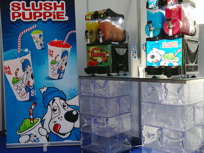 Modell 1: Slush-Eis-Stand mit kostenlosem Slush-Eis für Ihre Kunden. Das Slush-Eis wird durch uns hergestellt und an die Kunden verteilt. Inklusive aller Kosten wie Slush-Eis-Konzentrat, Becher, Strohhalme usw.